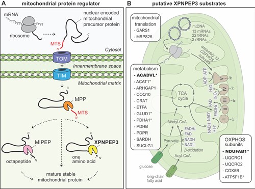 Figuur 1. (A) Schematische weergave van de functie van het XPNPEP3 eiwit in het mitochondrium. (B) Mogelijke substraten waarop het XPNEP3 eiwit inwerkt [gemaakt door Claudine Ruijmbeek, PhD student].
