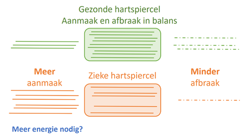 Resultaten: Met behulp van een zogenaamde proteomics analyse hebben we onderzocht welke veranderingen optreden in het hart van kinderen met een hartziekte, en een vergelijking gemaakt met gezonde harten en harten van volwassenen met een hartziekte. Proteomics is een combinatie van twee woorden, proteïne wat eiwit betekent, en –omics, wat zoveel betekent als ‘heel veel dingen meten’. M.a.w. we meten heel veel eiwitten in het hart. Onze analyse liet zien dat de twee mogelijke oorzaken die we hadden bedacht niet kloppen. De processen die betrokken zijn bij de aanmaak van hartspiercellen zijn juist extra actief in het hart van kinderen met een hartziekte. Tevens zijn de processen die betrokken zijn bij het afbreken van spiercellen minder actief (onderstaand figuur). Op grond van deze proteomics lijkt het erop dat het hart er alles aan doet om de bouwstenen in stand te houden, maar dat het helaas niet voldoende is, en het kost mogelijk heel veel energie. De energie die gestopt wordt in het aanmaken van de bouwstenen kan dan niet gebruikt worden voor andere belangrijke processen in het hart.
