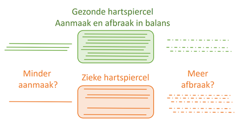 De groepen van Michiel Dalinghaus en Jolanda van der Velden hebben in een eerder studie gevonden dat het aantal bouwstenen in hartspiercellen van kinderen met een hartziekte lager is ten op zichte van een gezond hart of een hart van een volwassen persoon met een hartziekte. Doordat het aantal bouwstenen lager is, leveren de spiercellen van het hart minder kracht, en dat kan de oorzaak zijn van de slechte pompfunctie van het hart van deze kinderen. In ons vervolgonderzoek zijn we op zoek naar de oorzaak van de afname in het aantal bouwstenen, en hadden we voorafgaand aan het onderzoek twee mogelijke oorzaken bedacht weergegeven in het onderstaande figuur: 1) er worden minder bouwstenen aangemaakt in het hart, of 2) er worden meer bouwsteen afgebroken.